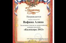 Ученица 7а класса Вафина Алина является призёром Всероссийского конкурса рисунков «Календарь 2012» Общества страхования жизни «Россия»!