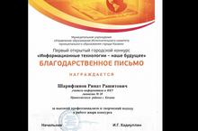 Поздравляем Шарифзянова Рината Рашитовича, учителя информатики и ИКТ с награждением БЛАГОДАРСТВЕННЫМ ПИСЬМОМ Управления образования Исполнительного комитета муниципального образования г.Казани за участие в первом открытом городском конкурсе «Информационные технологии – наше будущее»!