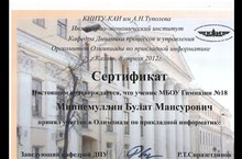 Вчера ученик 10 класса гимназии Миннемуллин Булат принял участие в олимпиаде по прикладной информатике, проводимой кафедрой ДПУ Инженерно-экономического института КНИТУ – КАИ им. А.Н.Туполева.