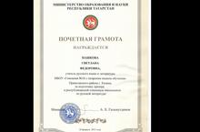Поздравляем Пашкову Светлану Федоровну, учителя русского языка и литературы, награждённую ПОЧЕТНОЙ ГРАМОТОЙ МОиН РТ за подготовку призёра в республиканской олимпиаде школьников по русской литературе!
