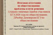 18 ноября 2020 года на платформе ZOOM прошло заседание консалтингового центра по подготовке к ЕГЭ по обществознанию на тему «Итоговая аттестация по обществознанию: проблемы и пути решения: 1)Анализ типичных ошибок участников ЕГЭ 2020 года по обществознанию. 2)Разбор Демоверсии ЕГЭ по обществознанию». На заседании принимали участие учителя обществознания Вахитовского и Приволжского районов. Были рассмотрены вопросы типичных ошибок допущенных в ЕГЭ 2020 года по обществознанию, изменения, критерии оценивания некоторых вопросов в ЕГЭ.