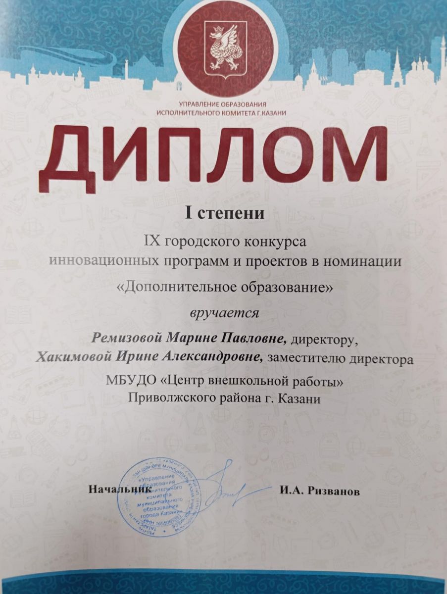 Опубликовано: 16.12.2024Поздравляем с заслуженной победой в IX городском конкурсе инновационных программ, проектов и методической продукции в номинации «Дополнительное образование» директора МБУДО «Центр внешкольной работы» Приволжского района Марину Павловну Ремизову и заместителя директора по учебно-воспитательной работе Ирину Александровну Хакимову. Успехов Вам, вдохновения, творчества и позитива каждый день!