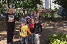 Воображаемый автобус, пассажирами которого стали взрослые и дети, отправился в сопровождении инспектора ГИБДД в пешую прогулку. Гид-полицейский обратил внимание детей на правила поведения во дворе, безопасные места для игр.