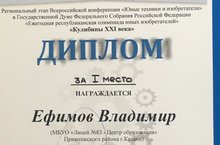 Поздравляем Ефимова Владимира с Победой на региональном этапе Всероссийской конференции "Юные техники и изобретатели "Кулибины 21 века"!