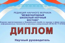 Дипломом научного руководителя за вклад в организацию исследовательской деятельности учащихся награждена директор лицея Д.Д. Бикуева редакцией научного журнала "Международный школьный научный вестник".