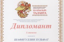 Поздравляем Шафигуллина Зульфата, ставшим Дипломантом I степени в Международном конкурсе -фестивале "На крыльях таланта" в номинации - Инструментальный жанр-фортепиано, 13-15 лет Соло (руководитель - Саттарова Резеда Абдрауфовна). Поздравляем!!!