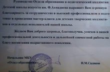 3 ноября директор нашей школы Резеда Инглисовна Сулейманова провела мастер-класс в Детской школе искусств им. Ф.Ахмадиева Рыбно-Слободского муниципального района РТ и была награждена благодарственным письмом Отдела образования Исполнительного комитета Рыбно-Слободского муниципального района РТ.