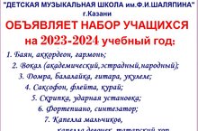 Муниципальное бюджетное учреждение дополнительного образования "ДЕТСКАЯ МУЗЫКАЛЬНАЯ ШКОЛА им.Ф.И.ШАЛЯПИНА" г.Казани объявляет набор учащихся на 2023-2024 учебный год по специальностям: 1) Баян, аккордеон гармонь; 2) Вокал (академический, эстрадный, народный); 3) Домра, балалайка, гитара; 4) Саксофон, флейта, курай; 5) Cкрипка, ударная установка; 6) Фортепиано, синтезатор; 7) Капелла мальчиков, капелла девочек, татарский хор. Запись на вступительные прослушивания по тел.8939311171 Сиразиев Раиль Рифхатович 24.08.2023