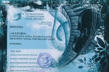 ПОЗДРАВЛЯЕМ!!! 2-6 ноября 2013г. в г.Казани состоялся V Международный конкурс-фестиваль "Viva Music". Преподаватели ДМХШ стали дипломантами конкурса: Струнный квартет "Allegro" в составе: Файзуллина А.Т., Ибрагимов И.А., Чичканов Д.А., Куликова А.А., Сиразиев Р.Р.(баян), концертмейстер - Халикова Р.Ф. 02.11.2013