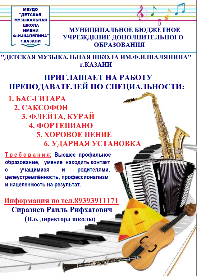 Муниципальное бюджетное учреждение дополнительного образования "ДЕТСКАЯ МУЗЫКАЛЬНАЯ ШКОЛА им.Ф.И.ШАЛЯПИНА" г.Казани приглашает на работу преподавателей по специальностям: Бас-гитара, Саксофон, Флейта, Курай, Фортепиано, Хоровое пение, Ударная установка. Информация по телефону: 8939311171 - Сиразиев Раиль Рифхатович