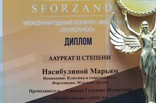8 декабря на Международном конкурсе Sforzando ученица нашей школы Насибулина Марьям (класс преподавателя Саидовой Г. Ш.) стала лауреатом 2 степени