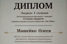 8 декабря в КЦ "Московский"состоялся Международный конкурс-фестиваль "SFORZANDO-2019".Поздравляем Олесю Машейко с победой, лауреат 2 степени, кл.преп. Вишняковой Э.И., концертмейстер Сабирзянова Н.Ю. Желаем дальнейших творческих успехов!