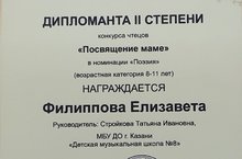 В этом году, на базе Культурного центра им.Пушкина, в Казани состоялся первый конкурс чтецов. Он был посвящен "Дню матери". От нашей школы на конкурсе выступила ученица 5кл.Филиппова Елизавета. Она исполняла "Балладу о матери" А. Дементьева.