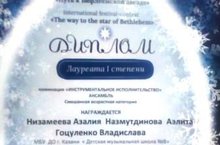 Международный фестиваль-конкурс "Путь к Вифлеемской звезде" - Низмеева Азалия, Назмутдинова Аэлита, Гоцуленко Владислава ДИПЛОМ Лауреата I степени.