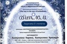Международный фестиваль-конкурс "Путь к Вифлеемской звезде" Машейко Олеся, Низамеева Азалия, Назмутдинова Аэлита, Гоцуленко Владислава, Халиуллина Карина, Халиуллина Кристина ДИПЛОМ Лауреата II степени.