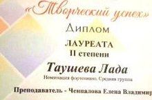 II Молодежный конкурс детских, юношеских, молодежных и взрослых творческих коллективов и исполнителей "Творческий успех" : Архипов Азат (преподаватель Пушина О.А., концертмейстер Таушева К.А.) - ДИПЛОМ ЛАУРЕАТА I степени, Паль Валерия (преподаватель Таушева К.А.)- ДИПЛОМ ЛАУРЕАТА I степени, Таушева Лада (преподаватель Ченпалова Е.В.) - ДИПЛОМ ЛАУРЕАТА II степени, Хаматова Алиса (преподаватель Вишнякова Э.И., концертмейстер Злобин А.Ю.) - ДИПЛОМ ЛАУРЕАТА II степени, Платонова Евгения (преподаватель Вишнякова Э.И., концертмейстер Злобин А.Ю.) - ДИПЛОМ ЛАУРЕАТА III степени.