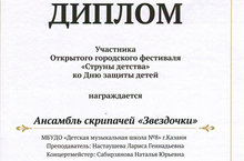 Всероссийский фестиваль конкурс классического музыкального искусства "Симфония талантов" Фролова Елизавета, Захарова Ксения номинация общее фортепиано ДИПЛОМ Лауреата I степени, Вакилова Сабина ДИПЛОМАНТ I степени -преподаватель Шаронова И.С., Сафина Л.Ш. Гатауллина Аделия номинация струнно-смычковые инструменты ДИПЛОМАНТ I степени- преподаватель Афандеева Л.М. Шигапова Камиля номинация струнно-смычковые инструменты ДИПЛОМ Лауреата III степени, Веселова София ДИПЛОМ Лауреата I степени, Фролова Светлана ДИПЛОМ Лауреата II степени -преподаватель Баландина Т.К. Ансамбль "Звездочки"-ДИПЛОМ Лауреат I степени, Шепелюк Натали -ДИПЛОМ Лауреат I степени -преподаватель Настаушева Л.Г.