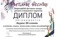 Всероссийский фестиваль-конкурс детского и юношеского творчества "Ритмы весны" Каримова Амина -Диплом Лауреата III степени, Мусиенко Софья-ДИПЛОМ Лауреата II степени, Ченпалова Е.В. и Саидова Г.Ш.-ДИПЛОМ Лауреата I степени.