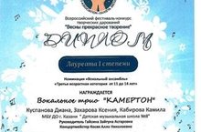 Всероссийский фестиваль-конкурс творческих дарований "Весны прекрасное творение" номинация "Вокальный ансамбль" вокальное трио "Камертон" (Куспанова Диана,Захарова Ксения,Кабирова Камиля) ДИПЛОМ Лауреата I степени.