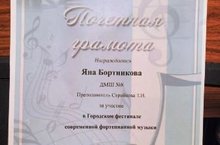 2 марта в ДМШ 4 состоялся Городской фестиваль современной фортепианной музыки, нашу школу и фортепианный отдел представляли Каримова Амина (преп. Е.В.Ченпалова) и Бортникова Яна (преп. Стройкова Т.И). Девочки - лауреаты 1го Открытого городского конкурса им. Д. Шостаковича, Яна - 1я премия, Амина - 2я.