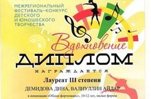 Межрегиональный фестиваль-конкурс детского и юношеского творчества "Вдохновение" Демидова Дина и Валиуллин Айдар в номинации "общее фортепиано" ДИПЛОМ Лауреата III степени.