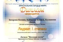 Международный фестиваль-конкурс детского и юношеского творчества "Хрустальное сердце мира" Трио девочек ДМШ №8 ДИПЛОМ Лауреата I степени.