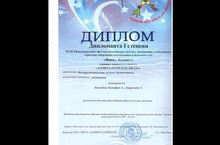 Награждена ДИПЛОМОМ Лауреата III степени Елистратова Полина за участие в Международном фестивале-конкурсе детских, юношеских, молодежных и взрослых творческих коллективов и исполнителей "Виват, Казань!" в номинации "инструментальная музыка (фортепиано)"