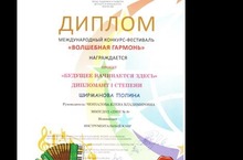 Награждена ДИПЛОМОМ Ширманова Полина в Международном конкурсе-фестивале "Волшебная гармонь" на проекте "БУДУЩЕЕ НАЧИНАЕТСЯ ЗДЕСЬ" в номинации инструментальный жанр.