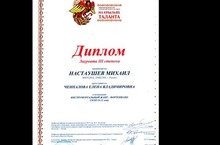 Награжден ДИПЛОМОМ Лауреата I степени Настаушев Михаил в Международном детском и юнешеском конкурсе-фестивале "На крыльях таланта" в номинации "Инструментальный жанр-фортепиано" соло (9-12) лет.
