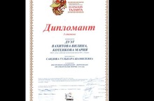Награждены ДИПЛОМАНТЫ I степени Дуэт Вахитова Вилина и Котенкова Мария в Международном детском и юношеском конкурсе-фестивале "На крыльях таланта" в номинации "инструментальный жанр-фортепиано" Ансамбли малые формы (5-8 лет)