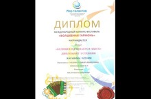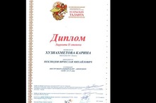 Награждена ДИПЛОМОМ Лауреата I степени Хузиахметова Карина в Международном детском и юношеском конкурсе-фестивале "На крыльях таланта" в номинации "Инструментальный жанр-аккордеон.Соло"