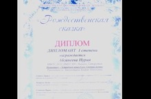 Награждена ДИПЛОМОМ Абганеева Нурия Дипломант I степени в Всероссийском фестивале-конкурсе детского и юношеского творчества "Рождественская сказка" в номинации "Эстрадный вокал.Соло.Средняя группа".