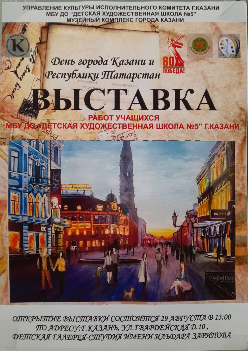 29 августа 2025 в 13:00 года прошло открытие выставки «День города Казани и Республики Татарстан». Экспозиция приурочена ко Дню Республики Татарстан и дню города. В Республике широко отмечается этот праздник. Выставка проходила по адресу г. Казань, ул. Гвардейская, 10 в галерее имени Ильдара Зарипова. На мероприятии представлены работы учащихся. Жители и гости Татарстана в большей степени прониклись к особенностям культуры республики. Для посетителей был незабываемым впечатлением, как сам праздник «День Республики Татарстан и День Города», так и сопричастность к изобразительному искусству.