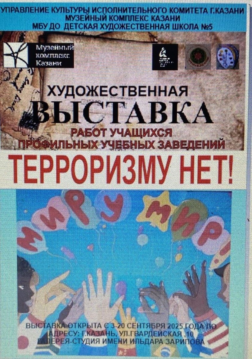 В галерее имени Ильдара Зарипова по адресу г. Казань, ул. Гвардейская , 10 проходила выставка работ с 3 по 20 сентября учащихся профильных учебных заведений "Терроризму нет!" 3 сентября день солидарности в борьбе с терроризмом. Этот день посвящён почтению памяти жертв террористических актов и выражению единства общества и государства перед лицом террористической угрозы.