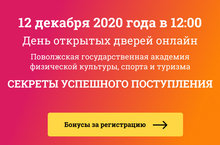 12 декабря 2020 года в 12.00 часов ФГБОУ ВО «Поволжская государственная академия физической культуры, спорта и туризма» проводит онлайн-мероприятие День открытых дверей с регистрацией. Ссылка для регистрации https://www.sportacadem.ru/registraciya_na_den_otkrytyh_dverej/. Проведение онлайн-мероприятий будет проходить на официальном Youtube-канале Академии https://www.youtube.com/channel/UCpB4E_WcGm48Lb8efYEdqWw. 11.12.2020