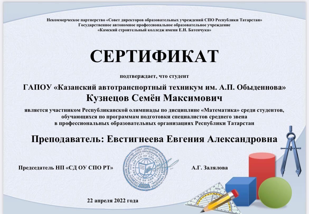 22 апреля 2022 года наши студенты: Кузнецов Семён (ТОД 219-1) и Еремин Никита под руководством преподавателя математики Евстигнеевой Евгении Александровны принимали участие в Республиканской олимпиаде по дисциплине «Математика» для студентов ПОО РТ.