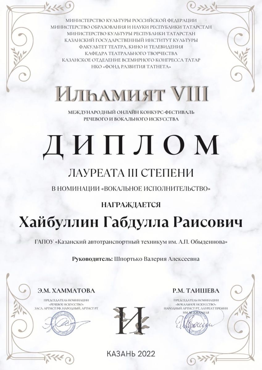 Студент группы ТОД 2111 Хайбуллин Габдулла стал лауреатом 3 степени в Международном фестивале «Ильхамият»