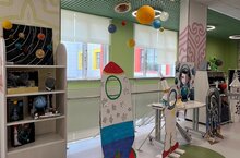 Чего здесь только нет! Обьемные тантамарески в виде ракет, космонавтов, где каждый желающий может сделать фото! Планеты солнечной системы, интересные факты об известных космонавтах, космосе и вселенной, фотоколлаж дети-космонавты, светящееся звездное небо, макеты спутников и даже инопланетяне!
