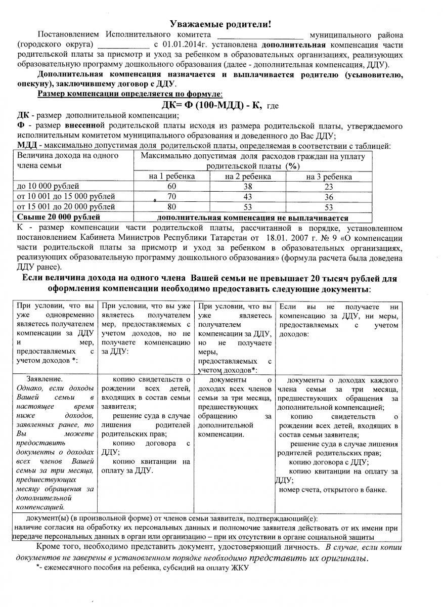 Дополнительная компенсация части родительской платы за присмотр и уход за ребенком в ДОУ