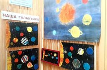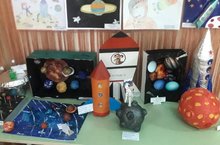 Выставка рисунков и поделок детей и их родителей "Космические фантазии", посвященная Дню космонавтики, развернулась в холле детского сада. Лучшие работы будут отмечены грамотами и подарками в конце неделе.