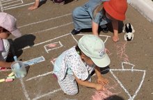 С 27 по 30 июля в детском саду проходит неделя посвященная детской безопасности. Одной из первых тем, затрагиваемой воспитателями в рамках этой недели, является тема "Один дома", цель которой развивать у детей навыки безопасного поведения дома, особенно, если он остался один. И, конечно, в ходе общения с воспитателями, дети рассказывают в каких домах они живут. Таким образом, и возникла идея провести конкурс рисунков на асфальте "Такие разные дома..."