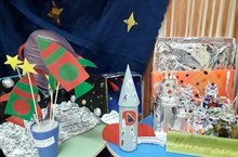 День космонавтики в детском саду мы отметили тематическим клубным часом, а в холле развернулась выставка работ детей и их родителей "Космические дали"
