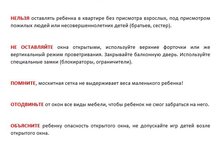 НИКОГДА не рассчитывайте на москитные сетки! Они не предназначены для защиты от падений! Напротив — москитная сетка способствует трагедии, ибо ребёнок чувствует себя за ней в безопасности и опирается, как на окно, так и на неё. Очень часто дети выпадают вместе с этими сетками. По возможности, открывайте окна сверху, а не снизу.
