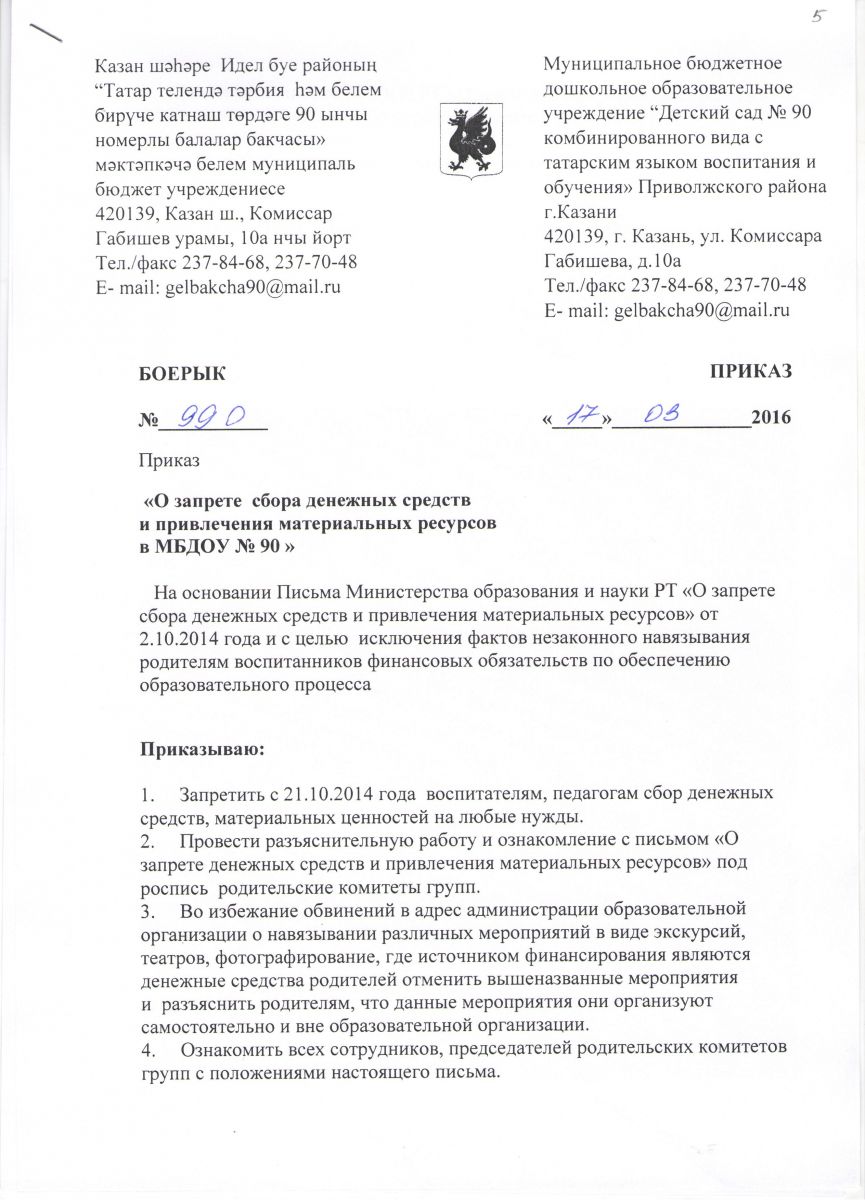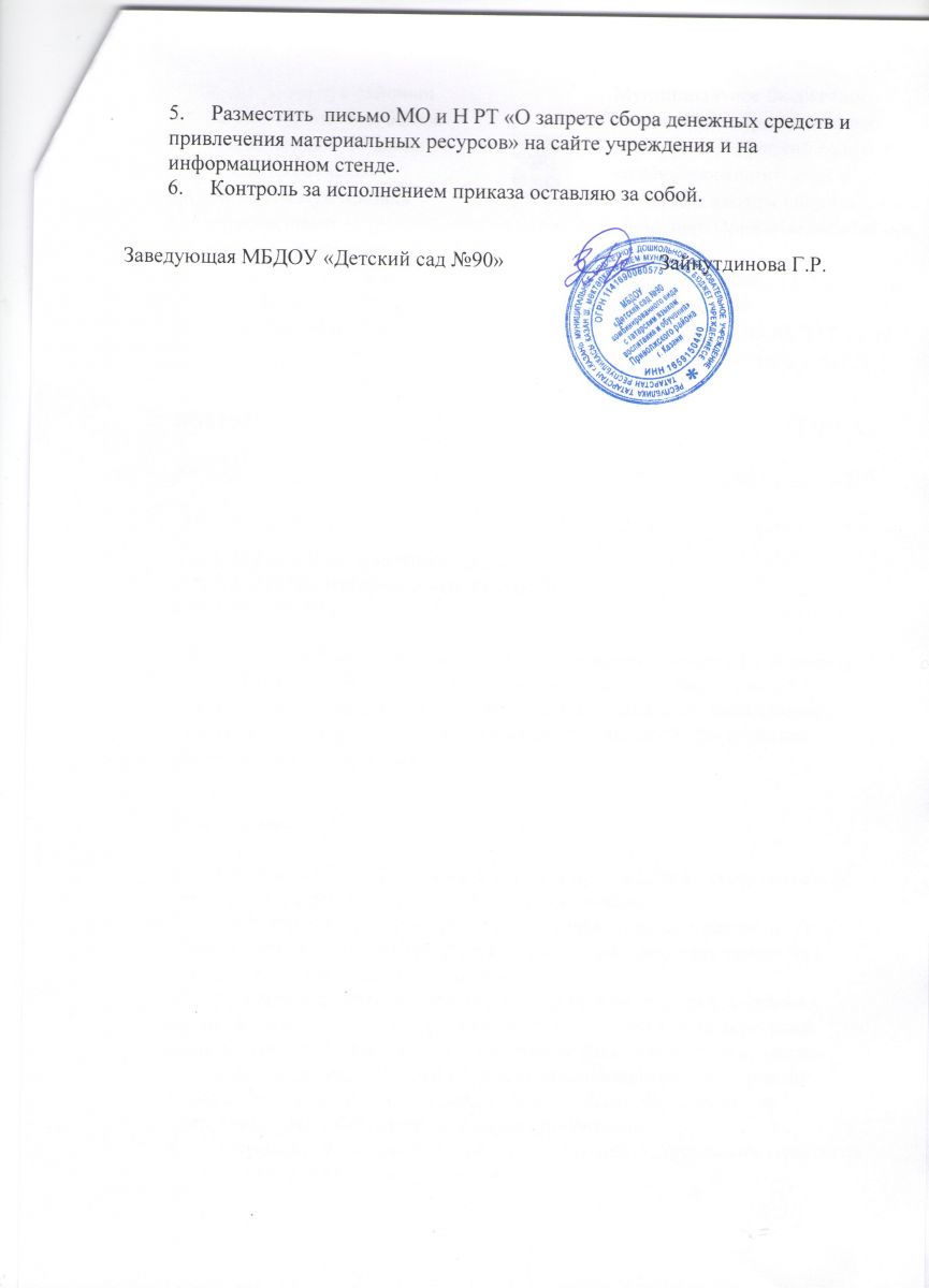Приказ № 99 МБДОУ "Детскийсад №90" Приволжского района г. Казани "О запрете сбора денежных средств и привлечения материальных ресурсов" стр2 стр3 стр4