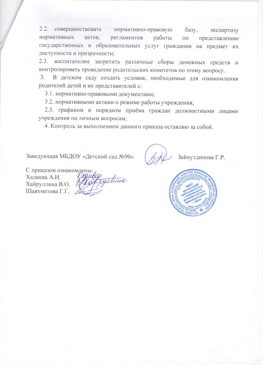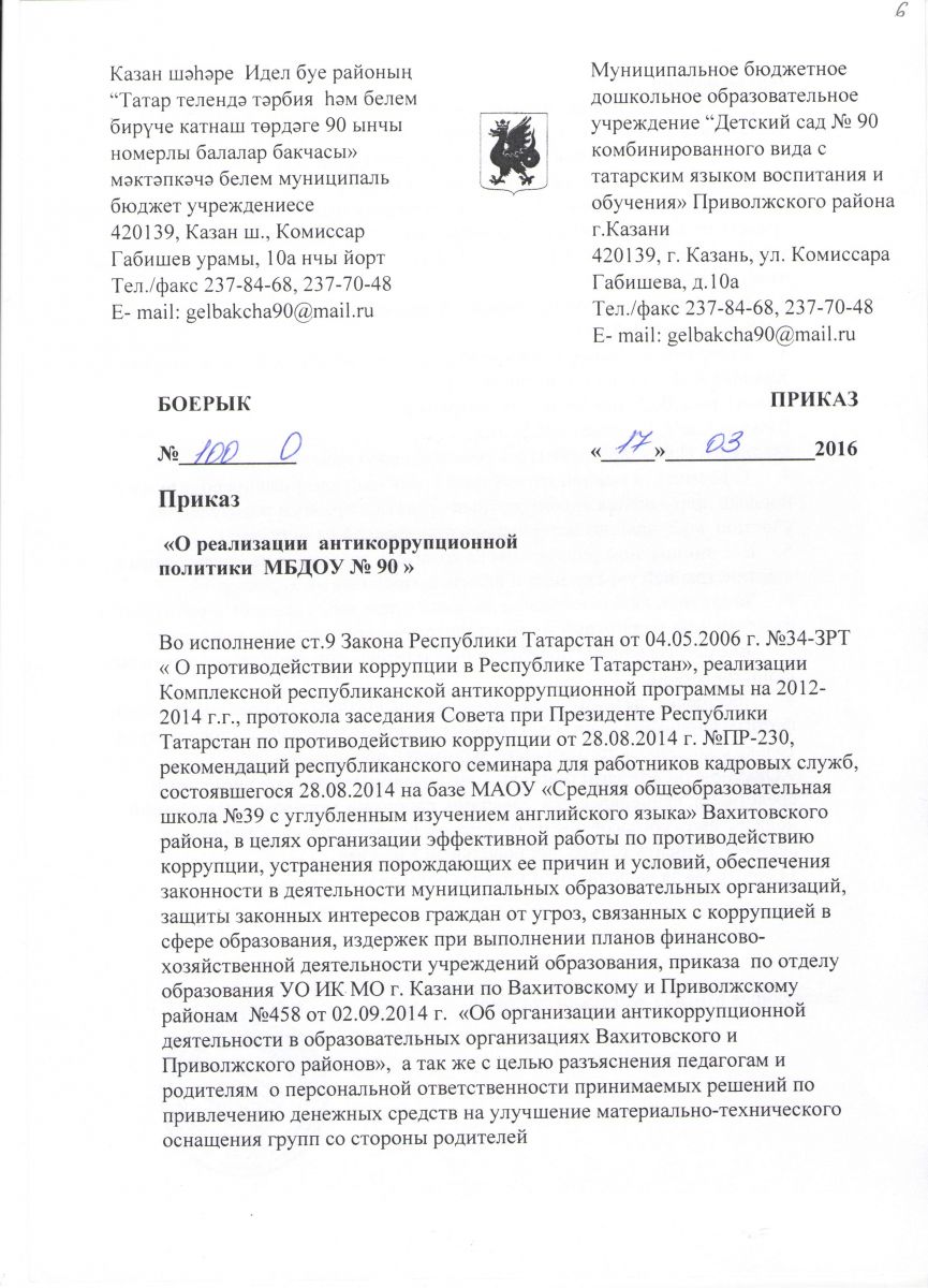 Приказ № 100 МБДОУ "Детскийсад №90" Приволжского района г. Казани "О реализации антикоррупционной поликити" стр2