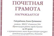 Министерством образования и науки РТ был проведен Всероссийский методический конкурс "Развитие коммуникативных навыков у учащихся при реализации программы "Разговор о правильном питании". Классный руководитель 6Г класса участвовала в конкурсе со своим проектом и заняла III место. Поздравляем!