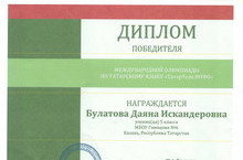 Поздравляем Булатову Даяну, ученицу 5Д класса (учитель Каримуллина А.Ф.), с победой в Международной олимпиаде по татарскому языку для школьников РФ и зарубежных стран "ТатарТеле.ИНФО".