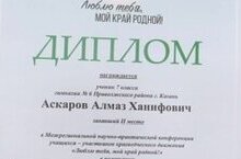 Ученик 7 Г класса Аскаров Алмаз стал призёром (II место) Межрегионального конкурса учащихся - участников краеведческого движения «Люблю тебя, мой край родной!», в рамках культурно-просветительского фестиваля «Территория талантов» в г.Пенза. Организатором конференции является Татарская национально-культурная автономия Пензенской области при грантовой поддержке Министерства внутренней и информационной политики Пензенской области
