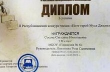 Сосова Света, ученица 2 В класса, стала победителем 2 Республиканского конкурса чтецов «Поэт- герой Муса Джалиль» ( руководитель - Бикмиева Роза Салимовна)