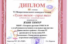 Поздравляем ученика 3 класса Яхина Тимура с дипломом 3 степени IV Межрегионального конкурса чтецов "Туган телем - серле тел" "Родной язык - волшебный язык". Педагог - Р. Р. Хуснуллина. Желаем дальнейших успехов!